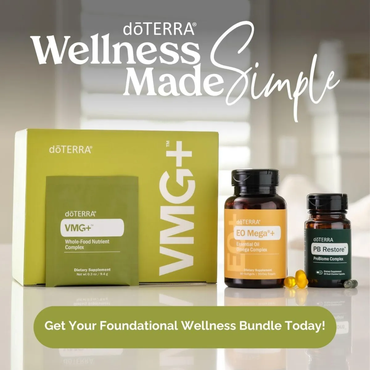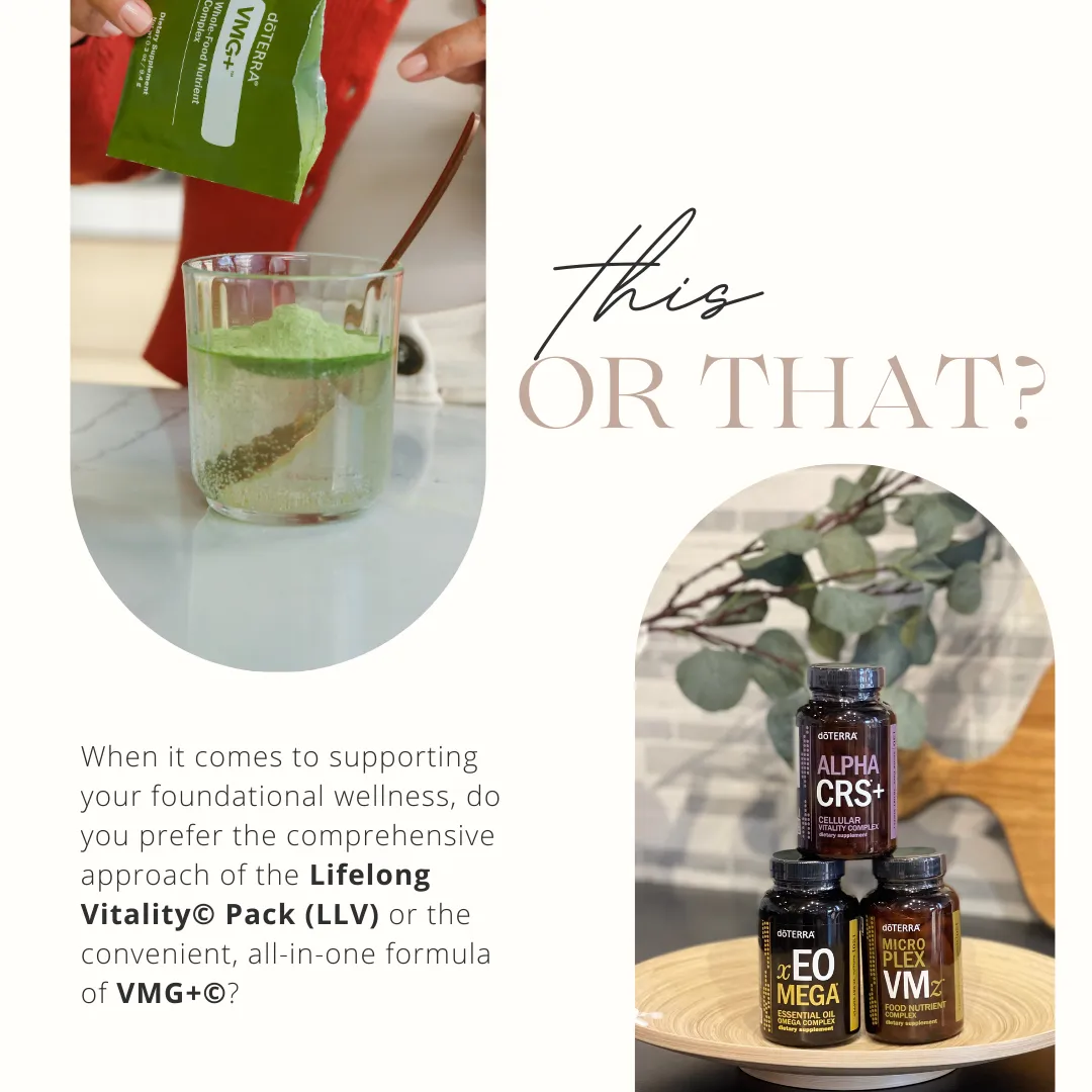 VMG+ Whole-Food Nutrient Complex is an advanced, all-in-one daily nutritional powdered drink designed to optimize foundational wellness and tastes great. It features over 90 high-quality ingredients, including whole-food vitamins and minerals, fruits, vegetables, digestive enzymes, probiotics, CPTG Certified Pure Tested Grade® essential oils, and other beneficial nutrients. This clean, vegan, and gluten-free formula delivers essential macro- and micronutrients that the body relies upon to support daily energy levels, immune system function, gut health and digestion, liver function, hormone function, and brain function.*